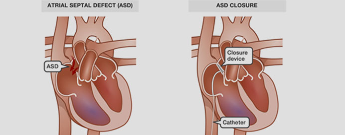 Procedure: A catheter is inserted into a blood vessel (usually in the groin) and guided to the heart. Once the catheter reaches the ASD, a device such as a septal occluder is deployed to close the opening. The device consists of two discs connected by a waist, which sandwich the septum to seal the hole.